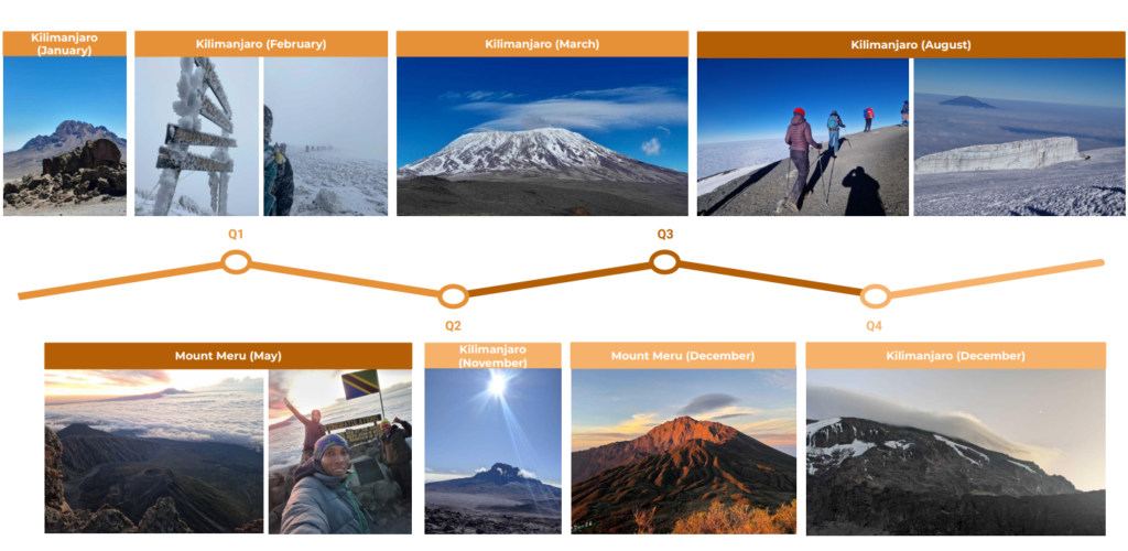 In the following graphik you can see pictures from our guides during the whole year, so you can get a nice impression. No guarantee (for sure), but nice to get an idea of the weather. We also recommend taking a look into our realtime ”Picture of the day” rubric, where our guides show the weather on the TOP of Africa on a daily basis.